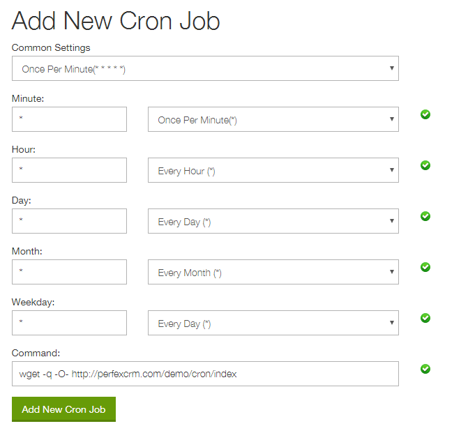 /usr/local/bin/php -f /home/username/public_html/installation_folder/index.php cron indexReplace username and installation_folder to fit for your path. If none of commands are not working you can use some free cron job service like https://www.easycron.com. Mostly the free cron job services have limit to execute each 10 minutes but it will work good too with Perfex CRM.